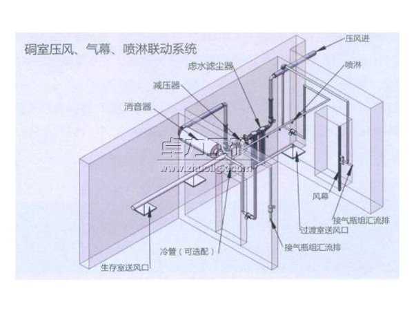 氣幕噴淋系統主要解決外界有毒有害氣體進入硐室和過渡室換氣問題。氣幕吹洗是在第一道門內側,使壓縮空氣通過氣幕管形成致密的氣簾,阻擋外界空氣的進入,同時掃除外界進入人員身上攜帶的有毒有害物質。噴淋則是通過注入大氣量的新鮮壓縮空氣,將有害氣體稀釋并通過泄壓閥排放到室外,以達到降低有害氣體濃度并凈化的目的。