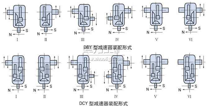 減速器按出軸形式可分為Ⅰ、Ⅱ、Ⅲ、Ⅳ、Ⅴ、Ⅵ六種裝配型式,按旋轉方向可分順時針(S)和逆時針(N)兩種方向,Ⅲ、Ⅳ、Ⅴ、Ⅵ型可裝制動或逆制裝置。如圖。