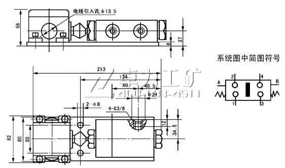 壓差開關的閥體和行程開關組裝在一塊底板上。潤滑脂在壓力的作用下從主管道B進入壓差開關閥體活塞的右腔,主管道A卸荷。一旦兩條主管道的壓差達到5MPa時,活塞克服左腔內彈簧力向左移動,并推動行程開關,使觸點1和2閉合,發出脈沖訊號至系統電控箱,責令換向閥換向,這時主管道A受壓,B卸荷,活塞在二端腔內彈簧的作用下對中,行程開關觸點1和2斷開,觸橋處中位。系統開始第二周期工作,一旦主管道A和B間壓差又達到5MPa時,活塞向右移動,行程開關觸點3和4閉合,脈沖訊號再次使系統中的換向閥換向,開始下次循環工作