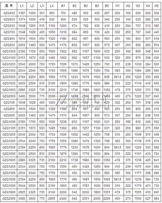 | GZG403 | 400×1000×200 | 30 | 60 | 1450 | 4 | ZG405 | 380 | 2×0.73 | 2×0.25 | 208 |